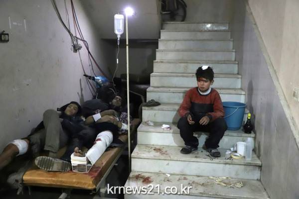 ▲ AFP / Amer ALMOHIBANY[제공자ⓒ 뉴스21통신. 무단전재-재배포 금지.]시리아 수도 다마스쿠스 외곽 도시 카프르 바트나(Kafr Batna)의 한 임시 병원에서 치료를 기다리고 있는 사람들.