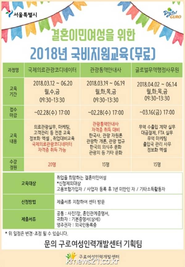 모든 교육과정은 취업을 희망하는 결혼이민여성이라면 누구나 신청할 수 있으나 고용보험가입자, 사업자 등록 후 1년 미만인 자, 기타소득활동자는 신청이 제한된다. 신청 시에는 사진1장, 혼인관계증명서, 귀화자의 경우 기본증명서(상세), 영주권자의 경우 외국인등록증을 지참하고 센터를 방문해 신청하면 된다. 교육과정에 대한 보다 자세한 사항은 구로여성인력개발센터 공식 홈페이지를 통해 확인이 가능하다.