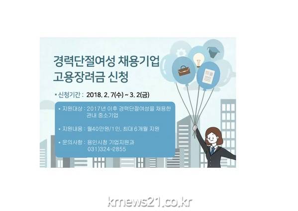 경력단절여성의 경제활동촉진법에 따라 용인시가 지난 2011년부터 실시하고 있는 이 사업의 지원대상은 2017년 이후 결혼, 임신, 출산, 육아 등의 사유로 경제활동을 중단한 여성을 고용한 중소기업이다. 1인당 월 40만원씩 최대 6개월까지 지원된다.