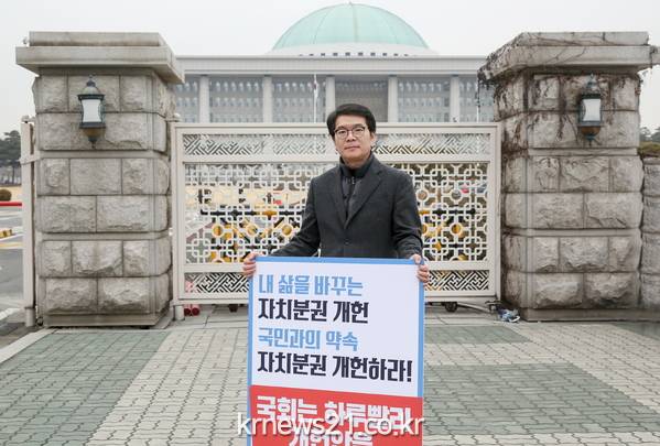 정원오 서울 성동구청장이 27일 국회의사당 앞에서 자치분권 개헌을 촉구하는 릴레이 1인 시위를 벌였다.