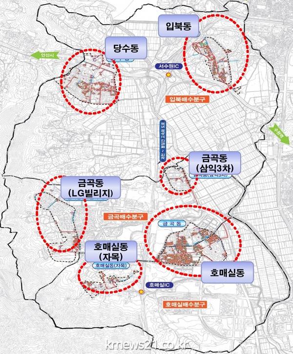 입북·금곡·호매실동 하수관로 정비공사에는 총 사업비 221억 원(국비 107억 원)이 투입되며, 공사 기간은 2018년 3월부터 2020년 6월까지다.