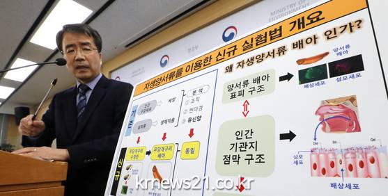 ▲ 여주홍 국립생물자원관 유용자원분석과장 여주홍 국립생물자원관 유용자원분석과장이 지난 6일 정부세종청사 환경부 기자실에서 '자생 무당개구리, 호흡기 질환 치료 물질 연구에 이용' 브리핑을 하고 있다. 환경부는 자생 무당개구리 배아를 이용해 호흡기 질환에 효과적인 물질 탐지법을 찾았으며 설치류 등의 포유동물 실험을 대체할 가능성을 확인했다고 발표했다.