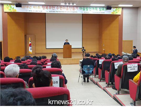 (뉴스21/장병기기자)=무안군은 지난 5일 청계면에서 수련마을 만들기에 참여한 11개 마을리더와 주민 등 총 160여 명이 참여한 가운데 ‘제5회 행복무안 수련마을 만들기 마을발전계획 발표회’를 전남농촌활성화지원센터와 공동 개최했다.