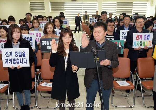 참석 공무원들은 ▲직무와 관련해 지위를 이용해 선거에 부당한 영향력의 행사, 기타 선거에 영향을 미치는 행위를 하지 않을 것 ▲소속직원, 선거구민에게 특정 정당이나 후보자의 업적을 홍보하거나 선거운동 기획에 참여하고, 기획의 실시에 관여하지 않을 것 ▲ 인터넷, SNS를 이용한 일체의 선거운동에 관여하지 않을 것 ▲공직선거법 시기별 제한․금지 규정을 철저히 준수해 선거개입의혹을 사전에 차단할 것 등을 결의했다.