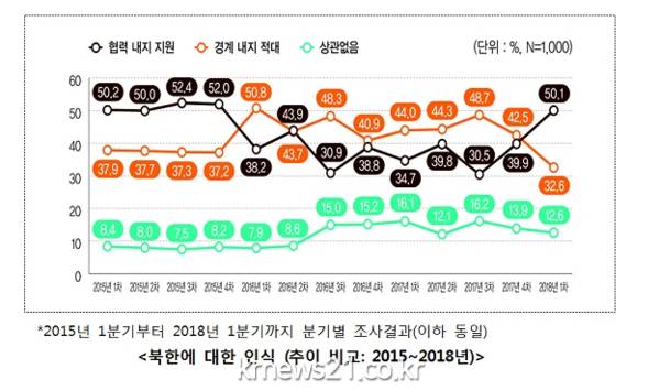 여론조사 결과, 북한에 대한 인식이 전분기와 비교해 ‘경계 내지 적대 대상’(32.6%)에서 ‘협력 내지 지원 대상’(50.1%)으로 전환됐다. ‘협력 내지 지원 대상’이라는 답변은 전분기(39.9%)보다 10.2%포인트 증가한 것으로, 2015년 4분기(52%) 이후 가장 높다. 2016년 1월 북한의 6차 핵실험 이후 대북 여론이 나빠져 ‘협력 내지 지원 대상’이라는 응답은 대체로 40%를 밑돌았다.