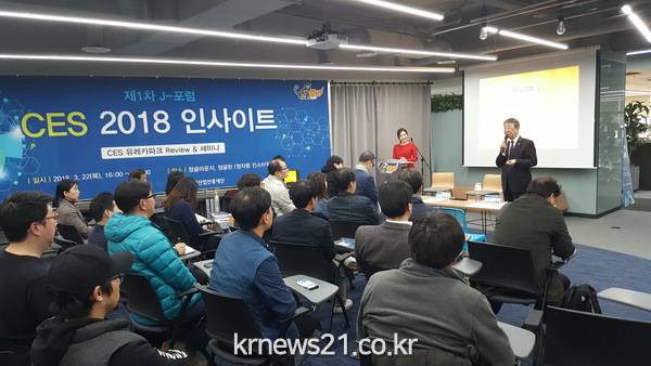 성남산업진흥재단(대표이사 장병화)는 3월 22일(목) 성남시 분당구 정자동에 있는 성남창업센터 정글on 19층에서 4차 산업혁명시대에 발맞춰 세계 최대 테크 전시회 CES 2018 주요 이슈를 소개하고 CES 2019 참가 정보 공유를 위한 '제1차 J-포럼'을 개최했다.