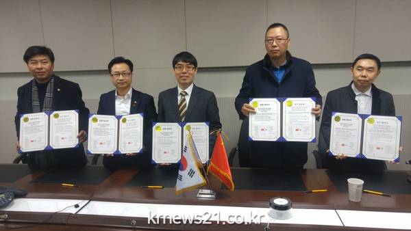 (좌측) WGDO 중국 총부 우융창 총감, WGDO 한국 분회 이영철 회장, 디지엔스 김성명 대표, 절강온주상회 총칭승 회장, 중경우방병원 자융 원장