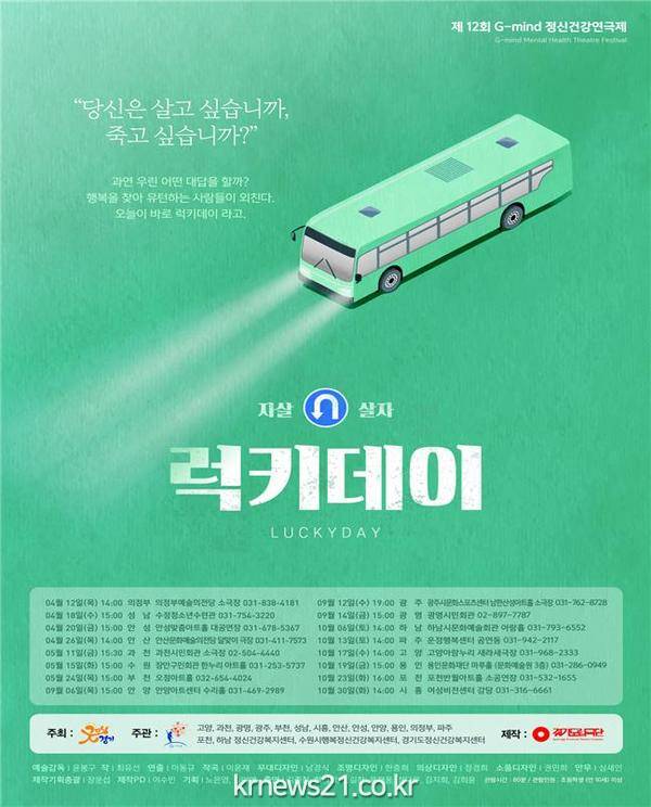 경기도는 정신건강 편견해소와 중요성을 홍보하기 위하여 제12회 G-mind 정신건강연극 「럭키 데이」를 경기도립극단을 통해 무대에 올린다. 이번 연극은 4월 12일 의정부 예술의 전당을 시작으로 도내 16개 시·군을 순회하면서 10월 30일까지 이어진다.