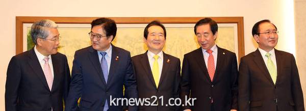 우원식(더불어민주당)·김성태(자유한국당)·김동철(바른미래당) 원내대표 등 기존 참석자에 이날 오전 교섭단체 등록을 마친 정의당 노회찬 원내대표가 새롭게 회동에 합류했다.