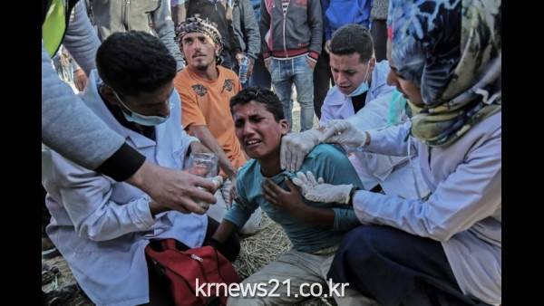 ▲ AFP / SAID KHATIB[제공자ⓒ 뉴스21통신. 무단전재-재배포 금지.]이스라엘 국경 근처인 팔레스타인 가자지구 남부 칸 유니스(Khan Yunis)에서 시위를 벌이다 이스라엘 보안군과의 충돌로 부상당한 팔레스타인을 돕고 있는 의료진. 30일(현지시간) 가자지구의 팔레스타인 주민들이 이스라엘과의 접경지역으로 이동하는 ‘위대한 귀환 행진’을 벌이다 이를 저지하는 이스라엘군의 발포로 16명이 사망했다.