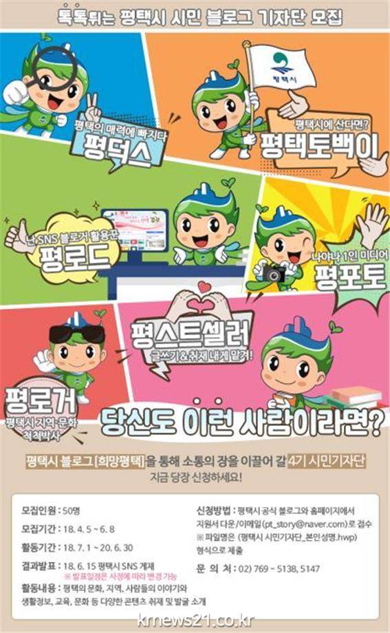 평택시(시장 공재광)는 오는 6월 8일까지 평택의 문화, 지역, 사람 등의 소식을 톡톡 튀게 전달해줄 제4기 희망평택 블로그 시민기자단을 모집한다.
