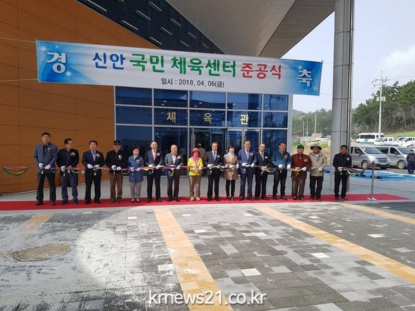 (뉴스21/장병기기자)=신안군민의 여가와 건강를 책임질 신안 국민체육센터가 2018년 4월 6일(금) 암태면에서 고길호 신안군수를 비롯한 지역 내외 귀빈 800여명이 참석한 가운데 준공식을 성황리에 개최하였다.새롭게 문을 연 신안 국민체육센터는 2010년 국민체육진흥기금 33억원을 지원받아 총사업비 75억원을 투입해 신안군 암태면 단고리 일원에 연면적 2,907㎡, 건축면적 3,102㎡, 지상 2층 규모로 건립되었다.