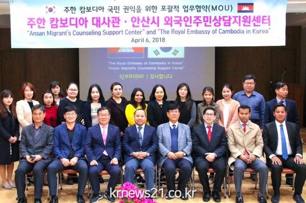 안산시 외국인주민상담지원센터(센터장 이복경)와 주한 캄보디아대사관(대사 롱 디망)은 지난 6일 다문화지원본부 3층 다목적실에서 상호 발전적 협력관계 및 상생발전을 위한 업무협약을 체결했다.