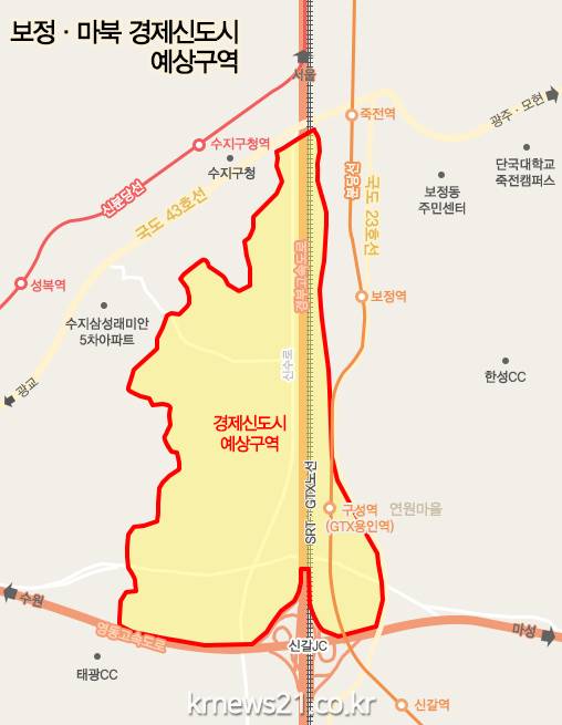 서울 근교의 마지막으로 남은 노른자위 땅인 용인시 기흥구 보정·마북·신갈동 일대 100만여 평에 경제신도시 건설이 본격 추진된다. 2021년 말 개통 예정인 수도권 광역급행철도 GTX 건설의 효과를 극대화하면서 당면한 국가적 과제인 경제 활성화와 일자리 창출을 적극 지원하려는 것이다.