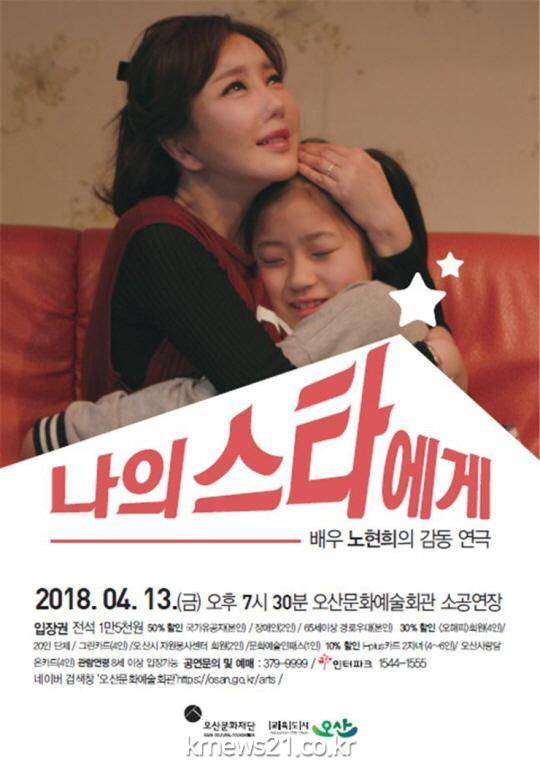 (재)오산문화재단에서는 오는 13일 오산문화예술회관 소 공연장에서 배우 노현희가 출연하는 연극 「나의 스타에게」가 공연할 예정이다.