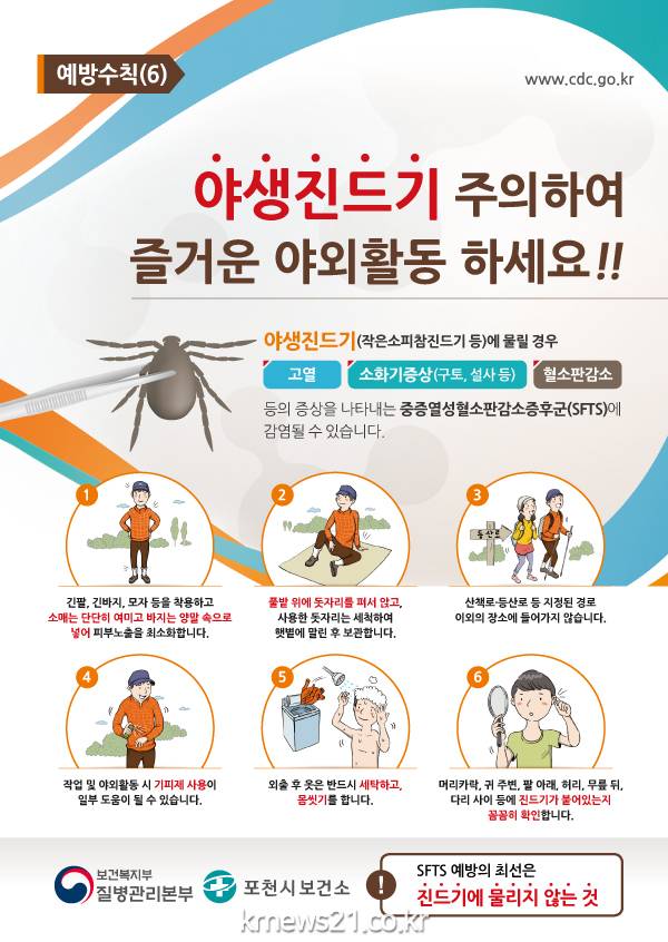 포천시는 올해 첫 진드기매개 감염병인 중증열성혈소판감소증후군(SFTS) 환자가 발생함에 따라 봄철 야외활동 및 농ㆍ작업 시 진드기에 물리지 않도록 예방관리 수칙을 철저히 준수할 것을 당부했다.