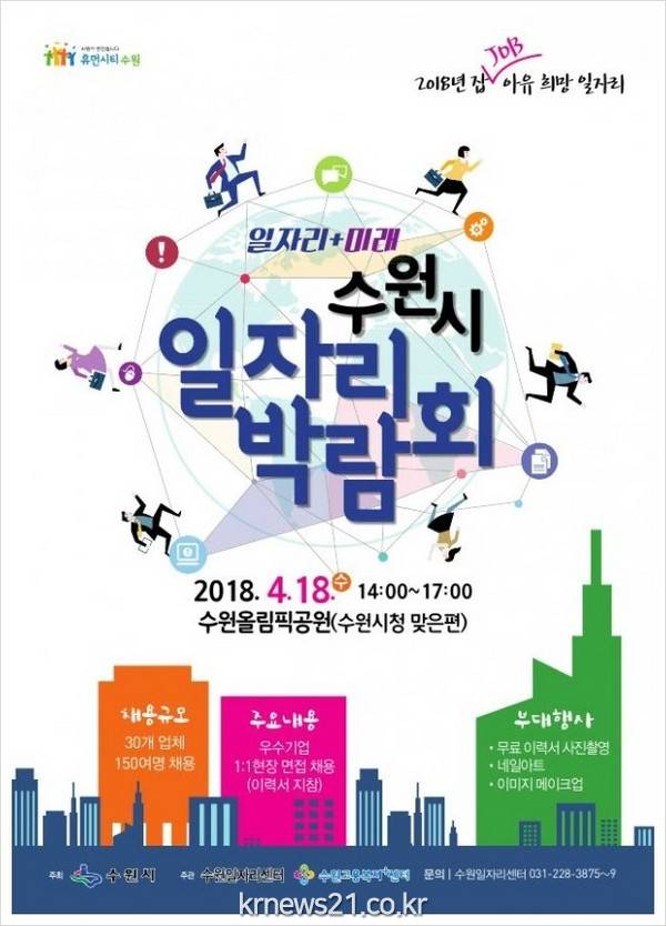 수원시는 18일 오후 2시부터 5시까지 수원 권선구 올림픽공원에서 ‘2018 일자리+미래 수원시 일자리박람회’를 연다.
