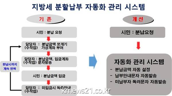 광주시 지방세 분할납부 자동화 시스템을 통해 기존에는 시민이 수시로 분할 납부를 요청하여 입금계좌를 부여받거나, 여러 명의 담당자가 각자 분납 신청자를 관리하며 매월 수작업으로 문자 발송 및 분납 관리를 하였으나 이를 모두 자동화함으로써 수작업 관리 업무로 인한 행정력 낭비를 방지하고 Smart한 행정운영을 추진할 수 있게 되었다.