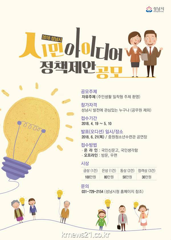 성남시는 오는 4월 19일부터 5월 10일까지 시민 대상 정책 아이디어를 공모한다. 오디션 방식으로 순위를 정해 최고 100만원의 시상금을 준다.