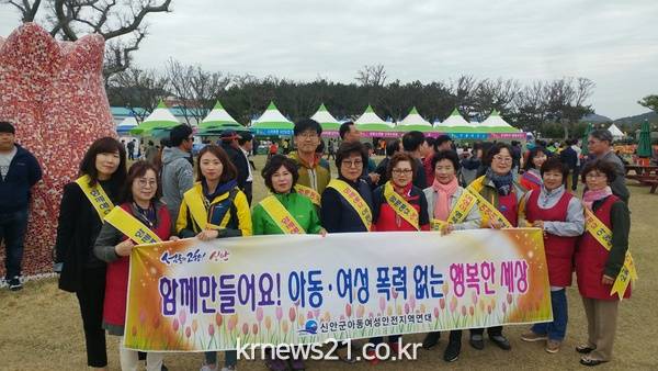 신안군 여성단체협의회 주관으로 펼쳐진 아동·여성 안전지역연대 캠페인은 여성단체협의회와 신안군 그리고 신안군 다문화가족지원센터 등 3개 단체 30여명이 튤립축제에 찾아온 관광객들에게 홍보물을 배부하며 어린이와 여성이 안전하고 행복한 사회를 만들기 위한 아동·여성 안전지역연대 캠페인을 펼쳤다.