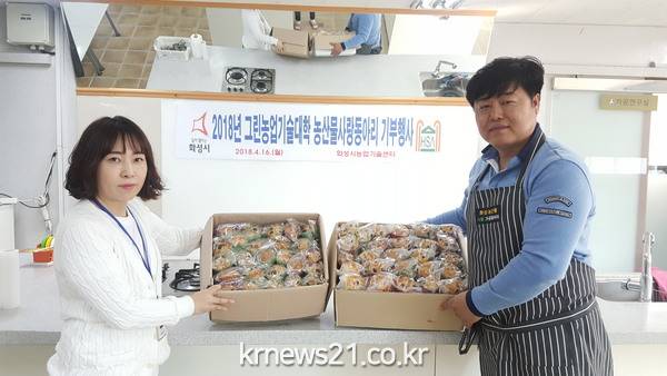 화성시 그린농업기술대학 농산물사랑 동아리 회원들이 이웃사랑을 실천하고자 지난 16일 화성시 남부 종합사회복지관 행복 나눔 푸드 뱅크에 직접 만든 쌀 빵을 기부했다.