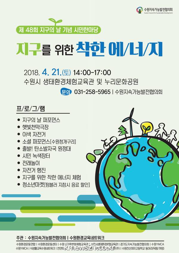 수원시는 21일 오후 2~5시 수원시생태환경체험교육관과 누리문화공원 일원에서 ‘지구를 위한 착한 에너지’를 주제로 ‘제48회 지구의 날’(22일) 기념행사를 연다.