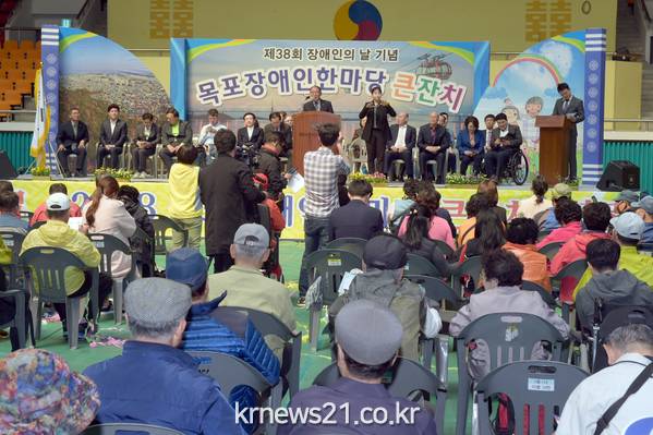 (뉴스21/장병기기자)=목포장애인한마당큰잔치추진위원회(회장 박일남)가 지난 17일 실내체육관에서 장애인과 가족, 자원봉사자 등 1천여명이 참여한 가운데 ‘제38회 장애인의 날 기념 목포장애인한마당큰잔치’를 개최했다.