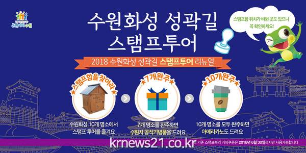 지난해 12월 시작된 수원화성 스탬프투어는 수원화성 주요 명소 10곳에서 스탬프 인증을 받은 이들에게 아메리카노 커피교환권과 소정의 기념품을 증정하는 관광 프로그램이다.