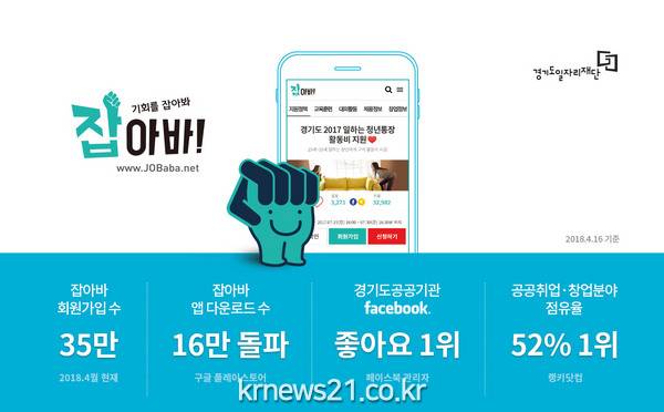 경기도일자리재단의 경기도고용지원플랫폼 ‘잡아바(www.JOBaba.net)’ 서비스가 ‘공공취업·창업분야’에서 2018년 1월 5주차부터 연속 11주 째 1위를 기록했다.