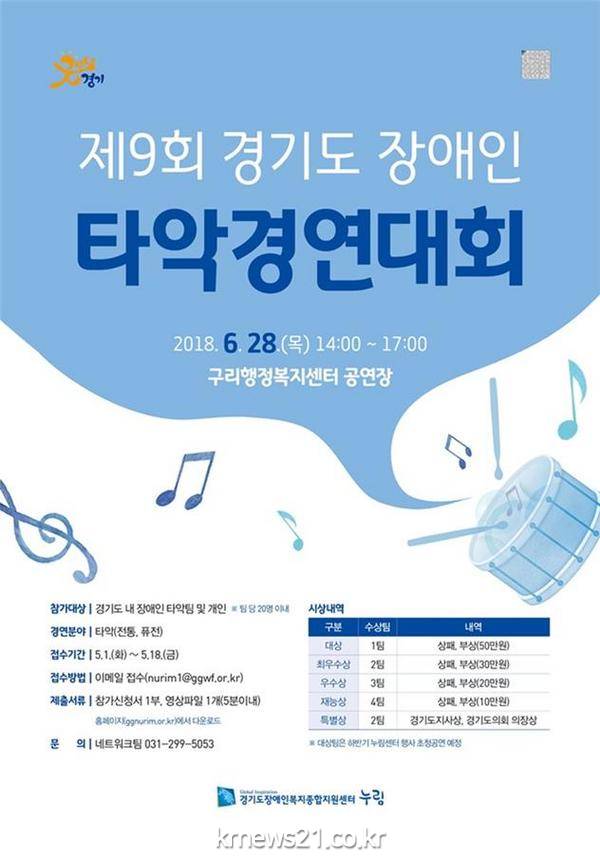 경기도 장애인복지 종합 지원센터(이하 누림 센터)에서는 ‘제9회 경기도 장애인 타악경연대회’ 참가자를 5월 1일(화)부터 18일(금)까지 모집한다.