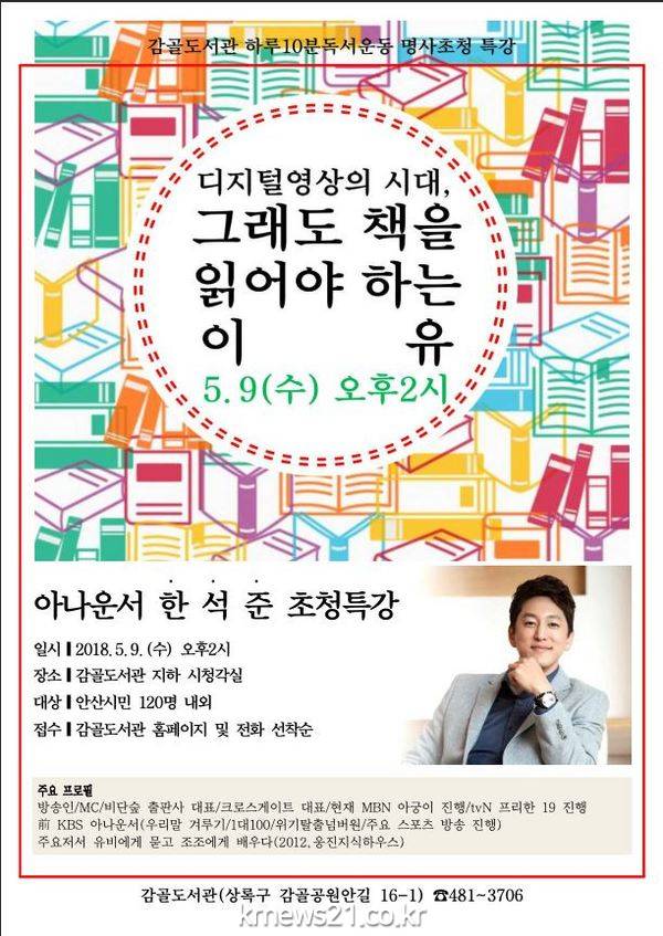 안산시 감골 도서관(관장 김종철)은 다음달 9일 오후 2시 방송인 한석준을 초청해 ‘디지털 영상의 시대, 그래도 책을 읽어야 하는 이유’라는 주제로 독서특강을 진행한다.