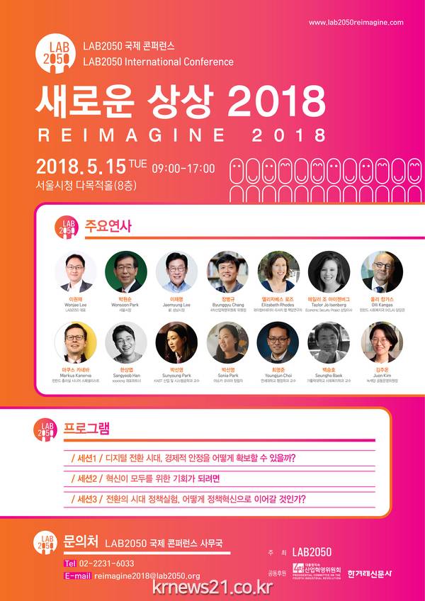 다음세대 정책실험실 LAB2050 (대표 이원재)가 주최하고 대통령 직속 4차 산업혁명위원회와 한겨레신문사에서 공동 후원하는 국제콘퍼런스 ‘새로운 상상 2018 (영문 REIMAGINE 2018)’이 개최된다.