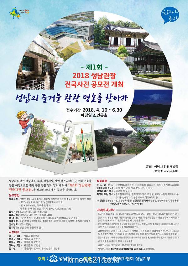 이번 공모는 성남지역 관광 명소, 영화 속 성남 촬영 현장, 자연·도시 경관, 전통시장, 이색 문화 현장, 특화된 거리 등의 관광자원을 널리 알리기 위해 마련된다.