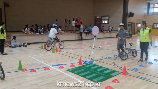 학교 강당이나 운동장을 실제 도로처럼 꾸며놓고 전문 강사 3명이 자전거 타기 이론과 실습 교육을 병행한다.