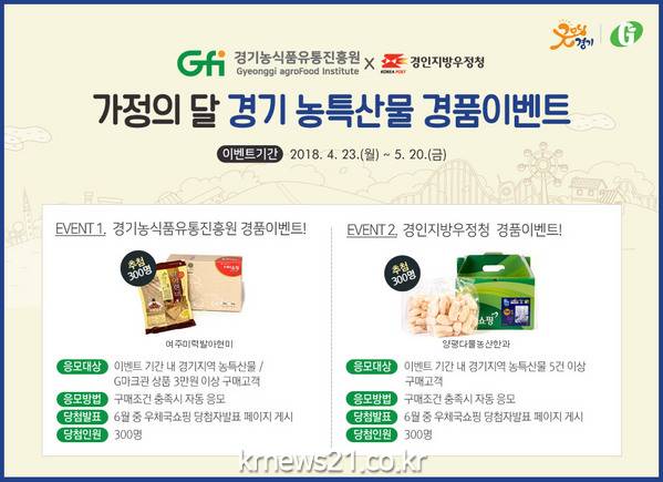 또, 동 기간 내 G마크관에서 3만 원 이상 상품 구매고객 중 자동추첨을 통해 300명에게 경기 명품 쌀인 여주미력발아현미 1포씩을 사은품으로 지급한다. 동시에 경인지방우정청에서도 경기지역 농·특산물 5건 이상 구매고객에 한해 자동 추첨해 300명에게 양평 다물농산 한과를 지급한다.