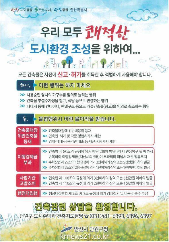 안산시 단원구(구청장 김창모)는 불법 건축물의 확산과 이로 인한 시민의 피해를 최소화 하고자 시민을 대상으로 불법 건축물 피해예방 홍보 활동을 전개한다.
