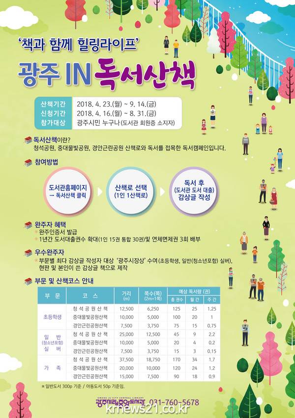 참가는 초등학생 이상 광주시민이면 누구나 가능하며 도서관 홈페이지에서 연령별 산책로 코스를 선택하고 책을 읽은 후 홈페이지 독서노트에 감상평을 기록해 정해진 코스를 달성하면 된다.