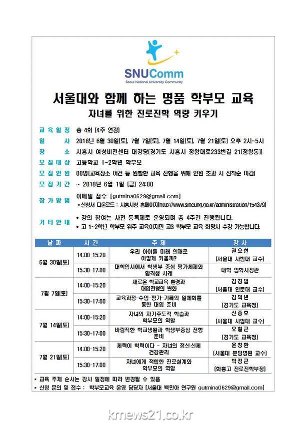 시흥시는 서울대 사범대학과 함께 오는 6월 30일부터 ‘자녀 진로진학 지도 역량 강화’를 위한 학부모 진로교육을 실시한다.