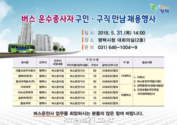 평택시는 ‘버스 운수종사자 구인구직 채용행사’를 오는 5월 31일 오후 2시 시청 대회의실에서 개최한다.