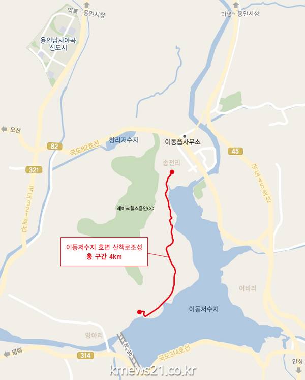 용인시는 처인구 이동읍 어비리 산 60번지 일원 사계절낚시터부터 남사면 방아1리까지 4km 구간에 숲속을 산책하며 저수지의 풍광을 감상할 수 있는 산책로 조성 공사를 시작했다고 25일 밝혔다