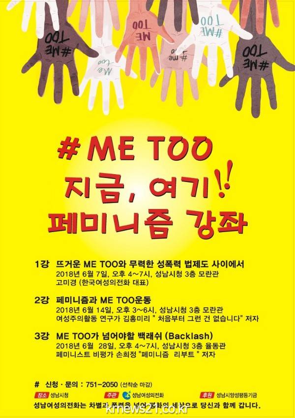 성남 여성의 전화는 우리 사회에 만연한 성차별과 성폭력에 대한 인식변화를 이끌어 내고자 해마다 ‘페미니즘 강좌’를 개최해오고 있다. 올해는 들불처럼 일어나고 있는 미투 운동과 관련한 강좌를 준비했다. 미투 운동의 의미와 미투 운동이 사회변화로 이어지기 위해서 개선해야 할 법제도와 과제에 대해서 "#ME TOO 지금 여기! 페미니즘 강좌“를 연다.