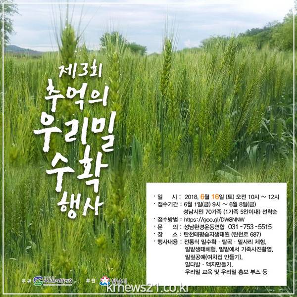 성남시는 ‘제3회 추억의 우리 밀 수확 체험’ 행사에 참여할 70가족(약 300명)을 모집한다.
