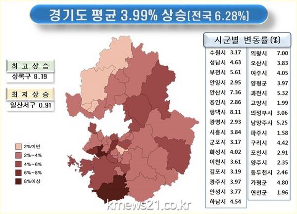 경기도 개별공시지가가 지난해보다 3.99% 오른 것으로 나타났다. 이는 전국 6.28%보다 2.29%, 수도권 5.37% 보다 1.38% 낮은 수치다.