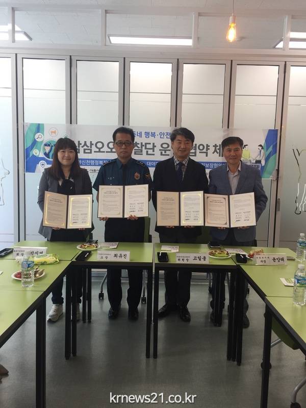 특히, ‘삼삼오오 순찰단’ 은 복지사각지대에 놓인 위기 가구를 발굴하고 안전한 동네를 만들기 위하여 민관 협력 사업으로 추진 할 예정이다. 협약 내용은 경찰관과 마을복지코디네이터, 동지역사회보장협의체 위원이 동행하여 독거노인 등 은둔형 가구에 대하여 월1회, 10가구 이상 가정방문을 실시하여 안부 순찰을 실시하고 위험에 노출된 주민에게는 즉시 맞춤형 서비스를 제공 할 계획이다.