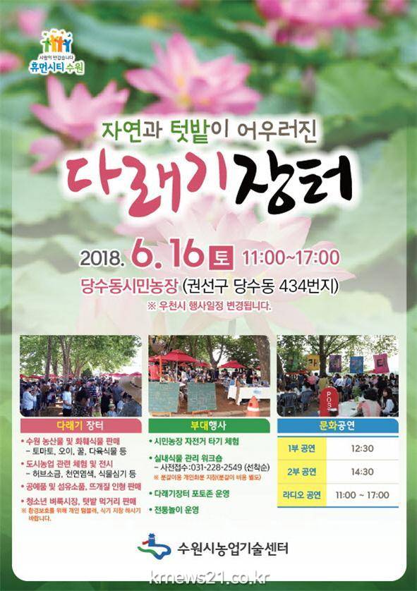 수원시 생산 농산물과 텃밭 먹거리, 지역 수공예 작가들이 만든 수공예품을 만나고, 문화 공연까지 즐길 수 있는 ‘다래기 장터’가 16일 오전 11시부터 오후 5시까지 당수동 시민농장에서 열린다.