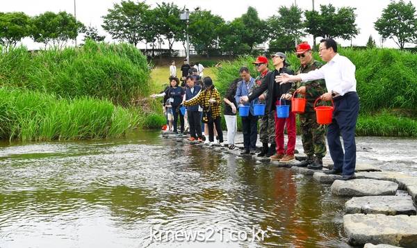 9회째를 맞이한 다슬기 치패 방류 행사는 내수면 수자원 조성 및 반딧불 서식을 위해 마련됐으며 이날 다슬기 치패 180㎏을 방류했다.