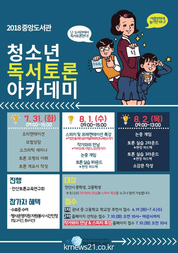 안산시 중앙도서관(관장 우호덕)은 관내 중‧고등학생을 대상으로 7월 31일부터 8월 2일까지 3일간 독서토론 아카데미를 진행한다.