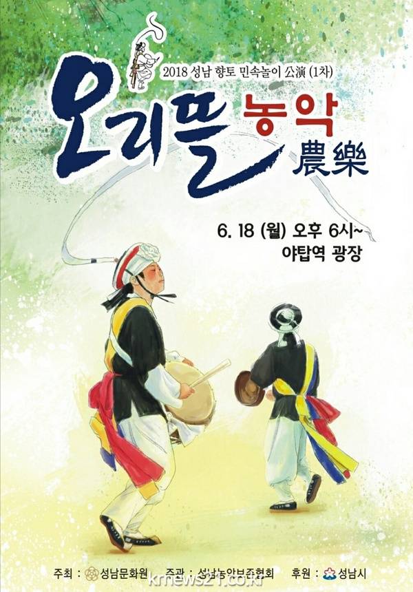 성남문화원(원장 김대진) 주최, 성남농악보존협회(회장 강승호)주관, 성남시가 후원하는 향토 민속놀이 ‘오리뜰 농악’ 공연이 6. 18(월) 오후6시 야탑역 광장에서 개최된다.