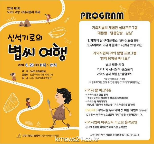 고양시 농업기술센터는 오는 23일(토) 센터 내 가와지 볍씨 박물관에서 ‘제1회 5020 고양 가와지 볍씨 축제’를 개최한다.