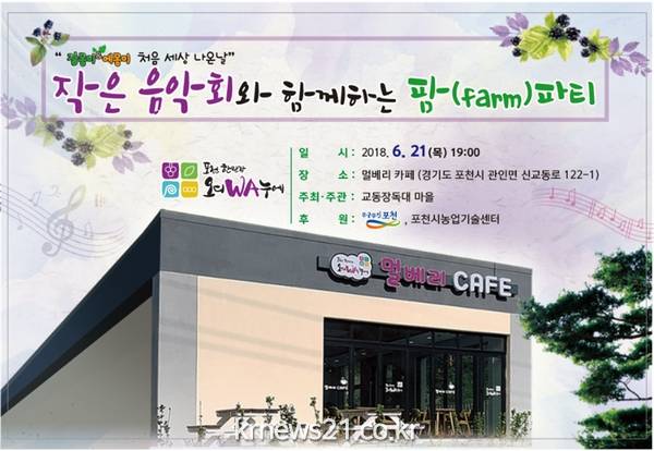 포천시 농업기술센터(소장 류충헌)는 작은 음악회와 함께하는 오디WA누에 팜파티를 6월 21일 19시에 오디WA누에 체험장(포천시 관인면 신교동로 122-1)에서 개최한다고 밝혔다.